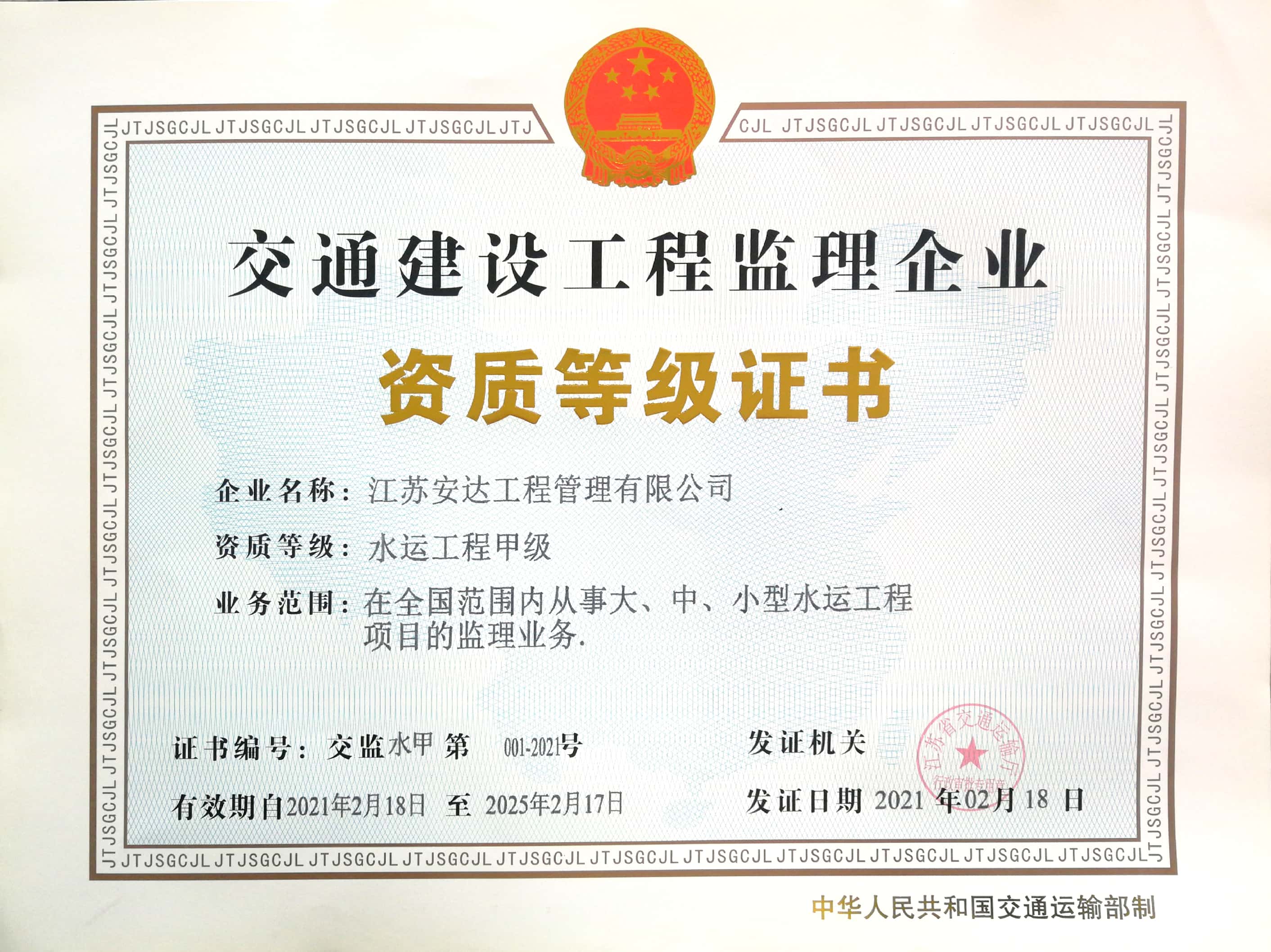 截止目前,完美online(中国)已拥有交通运输部公路工程甲级、水运工程甲级、市政公用工程乙级、房屋建筑工程乙级监理资质;同时还具有公路工程、市政公用工程施工总承包叁级,公路路面工程专业承包叁级施工资质等多项资质,促进了工程管理格局持续优化,资质等级结构大为改善,资质体系不断优化完善,为企业长远发展打下了坚实基础。